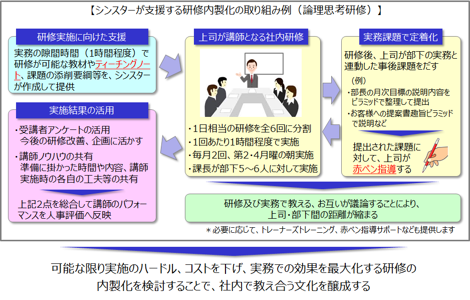 シンスターは研修の内製化の目的を単なる研修費の削減とは考えていません。研修の内製化を通じて、社員同士が教えあい、互いに成長し、結果として組織力が高まる。そのような自社の「教え合う文化の醸成」をすることが真の目的です。